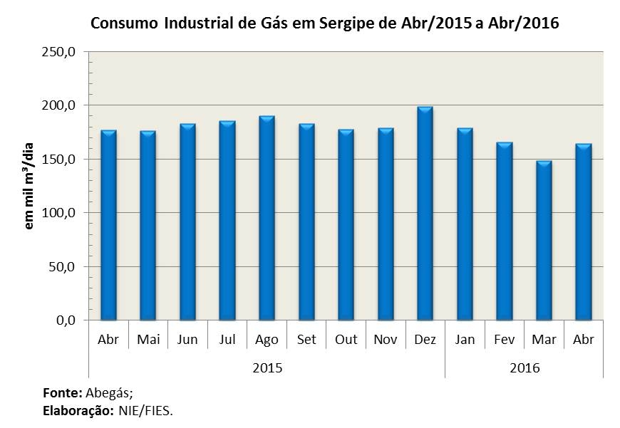 Análise realizada pelo Boletim Sergipe Econômico, parceria do Núcleo de Informações Econômicas (NIE) da Federação das Indústrias do Estado de Sergipe (FIES) e do Departamento de Economia da UFS, com base nos dados da Associação Brasileira das Empresas Distribuidoras de Gás Canalizado (ABEGÁS), apontou que foram consumidos, no quarto mês do ano, uma média de 263,4 mil metros cúbicos (m³) de gás diário em Sergipe. O consumo de gás foi 5,8% maior que o consumo do mês anterior, março último. Na comparação anual, em relação ao mesmo mês do ano passado (abril/2015), o consumo apresentou redução de 4,3%.