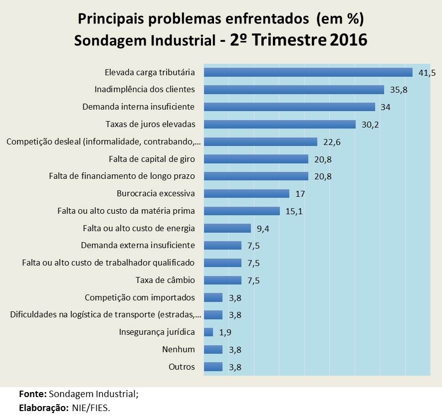 De acordo com os dados da Sondagem Industrial o Volume de Produção, somou 42,5 pontos no mês em análise, ficando 1,6 pontos menor que o volume de registrado em Maio, o que indica uma retração na produção. Também foram levantadas informações sobre as dificuldades enfrentadas pelos empresários industriais de Sergipe, sendo que a “Elevada carga tributária” foi citada por 41,5% dos empresários sergipanos, como um dos principais problemas enfrentados. Seguido pela “Inadimplência dos clientes” (35,8%) e “Demanda interna insuficiente” (34%). As “Taxas de juros elevadas” (30,2%) e a “Competição Desleal” (22,6%) também foram problemas bastante citados pelos empresários.