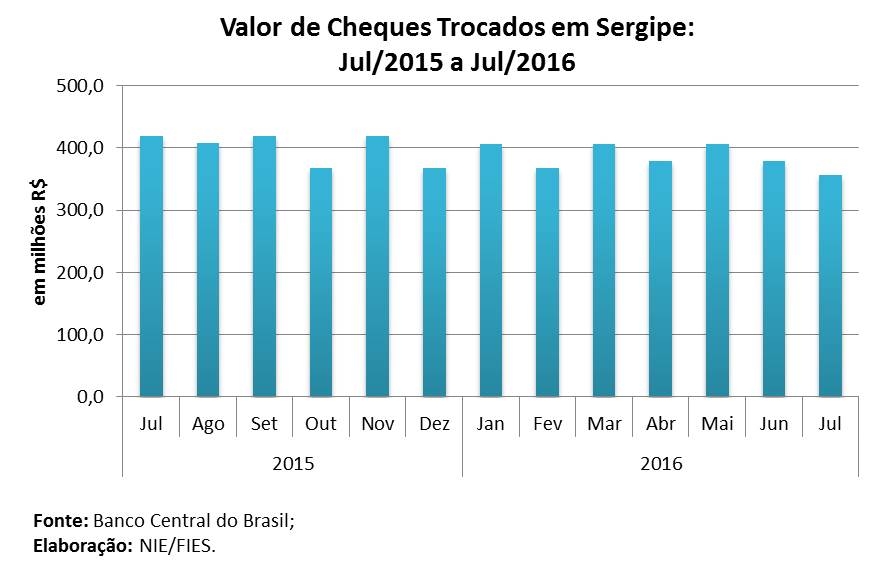 Análise realizada pelo Boletim Sergipe Econômico, parceria do Núcleo de Informações Econômicas (NIE) da Federação das Indústrias do Estado de Sergipe (FIES) e do Departamento de Economia da UFS, com base nas estatísticas do Banco Central, apurou que, em julho desse ano, o valor de cheques trocados, em Sergipe, foi de R$ 358,6 milhões, sendo 21,7% menor que o valor dos cheques compensados no mesmo mês de 2015. No comparativo mensal, o valor foi 6,2% menor que o volume registrado em junho deste ano.