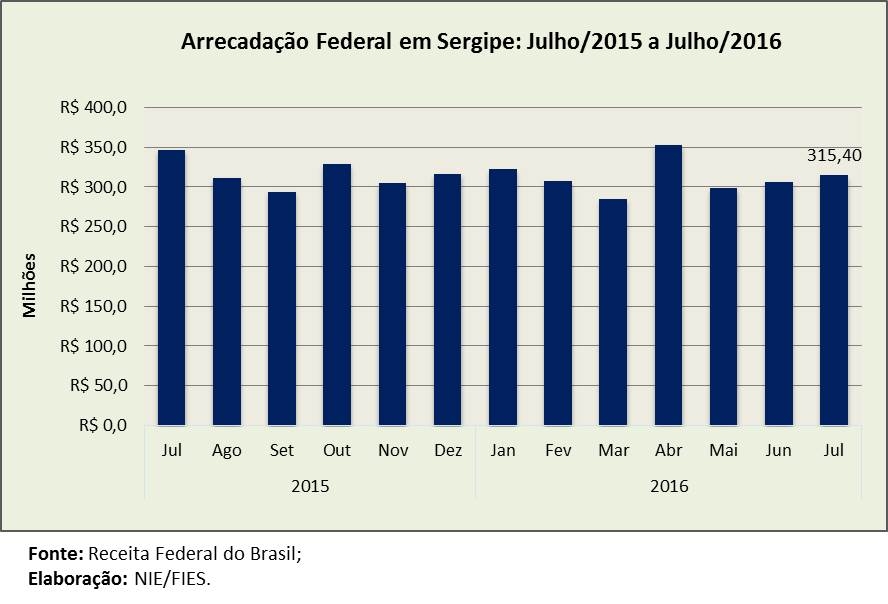 Análise realizada pelo Boletim Sergipe Econômico, parceria do Núcleo de Informações Econômicas (NIE) da Federação das Indústrias do Estado de Sergipe (FIES) e do Departamento de Economia da UFS, com base nos dados da Receita Federal, verificou que a arrecadação de julho desse ano ficou em aproximadamente R$ 315,4 milhões, assinalando crescimento de 2,1%, quando comparado aos tributos recolhidos no mês imediatamente anterior, junho último.