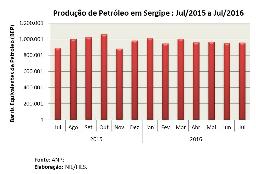 Análise realizada pelo Boletim Sergipe Econômico, parceria do Núcleo de Informações Econômicas (NIE) da Federação das Indústrias do Estado de Sergipe (FIES) e do Departamento de Economia da UFS, com base nos dados da Agência Nacional do Petróleo, Gás Natural e Biocombustíveis (ANP), mostrou que a produção de petróleo no estado, em julho de 2016, ultrapassando os 955 mil barris equivalentes de petróleo (BEP), ficando 0,5% acima da produção do mês anterior, junho último. Já no comparativo anual (julho/2015), o crescimento foi de 7% na produção.