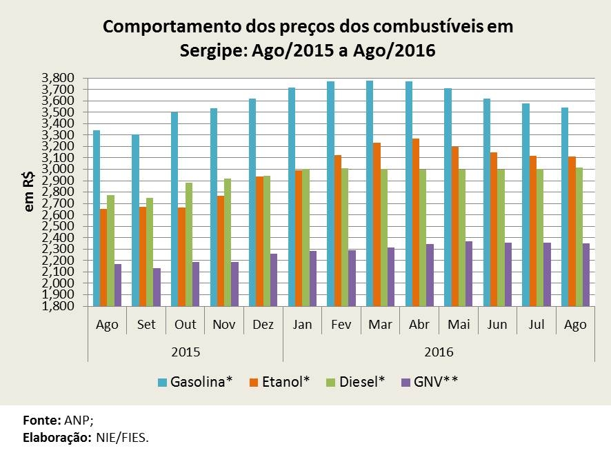 Análise realizada pelo Boletim Sergipe Econômico, parceria do Núcleo de Informações Econômicas (NIE) da Federação das Indústrias do Estado de Sergipe (FIES) e do Departamento de Economia da UFS, com base nos dados da Agência Nacional do Petróleo, Gás Natural e Biocombustíveis (ANP), observou que no oitavo mês do ano, o preço médio cobrado pelo litro da gasolina no estado ficou em R$ 3,543, registrando redução de 0,9% no preço, em relação ao último mês de julho, sendo o quinto mês consecutivo de queda. No entanto, quando comparado com agosto do ano passado, observou-se uma elevação de 6% no preço médio, variações em termos absolutos, sem considerar o efeito da inflação no período.