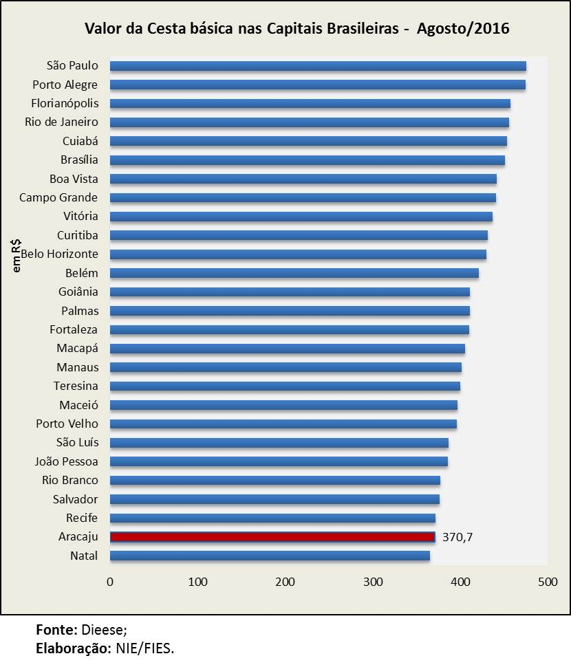 Análise realizada pelo Boletim Sergipe Econômico, parceria do Núcleo de Informações Econômicas (NIE) da Federação das Indústrias do Estado de Sergipe (FIES) e do Departamento de Economia da UFS, com base nos dados da Pesquisa Nacional da Cesta Básica, realizada pelo Departamento Intersindical de Estatística e Estudos Socioeconômicos (DIEESE), apontou que o valor da cesta básica registrado na capital sergipana, em agosto deste ano, foi de R$ 370,70, sendo o segundo menor entre as capitais brasileiras. Desde janeiro de 2016, o DIEESE vem publicando os resultados das 27 capitais brasileiras. O menor valor registrado no mês foi observado em Natal (R$365,46). Já os maiores custos da cesta básica foram registrados em São Paulo (R$ 475,11), Porto Alegre (R$ 474,34) e Florianópolis (R$ 457,11).