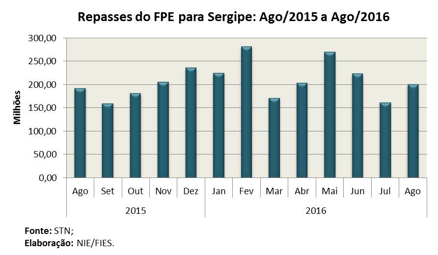 Análise realizada pelo Boletim Sergipe Econômico, parceria do Núcleo de Informações Econômicas (NIE) da Federação das Indústrias do Estado de Sergipe (FIES) e do Departamento de Economia da UFS, com base nos dados da Secretaria do Tesouro Nacional (STN), indicou que o repasse do Fundo de Participação dos Estados (FPE) para o estado de Sergipe, no oitavo mês do ano, ultrapassou os R$ 201 milhões, registrando retração de 3,8% em termos reais (descontando a inflação, medida pelo Índice Nacional de Preço ao Consumidor Amplo-IPCA), em comparação com o mês de agosto de 2015.