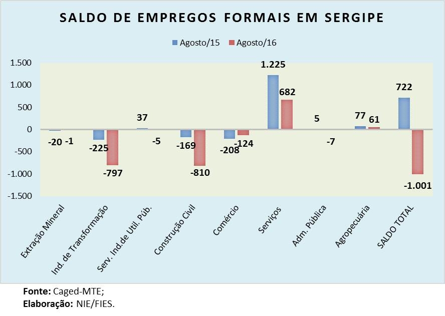 Análise realizada pelo Boletim Sergipe Econômico, parceria do Núcleo de Informações Econômicas (NIE) da Federação das Indústrias do Estado de Sergipe (FIES) e do Departamento de Economia da UFS, com dados do Cadastro Geral de Empregados e Desempregados (Caged), do Ministério do Trabalho e Previdência Social (MTPS), indicou que, no mês de agosto de 2016, Sergipe apresentou um saldo (total de admissões menos total de desligamentos) negativo de 1.001 empregos formais.