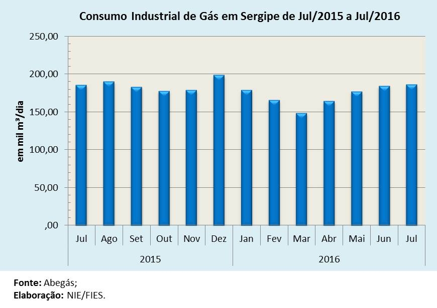 Análise realizada pelo Boletim Sergipe Econômico, parceria do Núcleo de Informações Econômicas (NIE) da Federação das Indústrias do Estado de Sergipe (FIES) e do Departamento de Economia da UFS, com base nos dados da Associação Brasileira das Empresas Distribuidoras de Gás Canalizado (ABEGÁS), apontou que foram consumidos, no mês de julho desse ano, uma média de 282,6 mil metros cúbicos (m³) de gás diário em Sergipe. O consumo de gás foi igual ao do mês anterior. Na comparação anual, em relação ao mesmo mês do ano passado (julho/2015), o consumo apresentou crescimento de 1,3%.