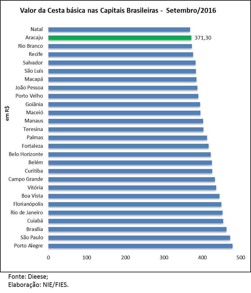 Análise realizada pelo Boletim Sergipe Econômico, parceria do Núcleo de Informações Econômicas (NIE) da Federação das Indústrias do Estado de Sergipe (FIES) e do Departamento de Economia da UFS, com base nos dados da Pesquisa Nacional da Cesta Básica, realizada pelo Departamento Intersindical de Estatística e Estudos Socioeconômicos (DIEESE), apontou que o valor da cesta básica registrado na capital sergipana, em setembro deste ano, foi de R$ 371,30, sendo o segundo menor entre as capitais brasileiras, porém ficou 0,16% maior que o registrado no mês imediatamente anterior. Desde janeiro de 2016, o DIEESE vem publicando os resultados das 27 capitais brasileiras. O menor valor registrado no mês foi observado em Natal (R$367,54). Já os maiores custos da cesta básica foram registrados em Porto Alegre (R$ 477,69), São Paulo (R$ 471,57) e Brasília (R$ 461,99).