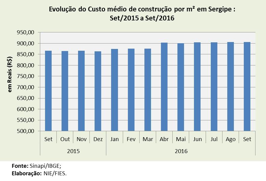 O valor do custo médio por metro quadrado ficou em R$ 906,48, sendo o menor valor registrado entre os estados brasileiros, no período analisado. Em relação ao mês de setembro de 2015, houve alta de 4,6% no custo médio, enquanto que no acumulado dos primeiros nove meses do ano, o custo médio subiu 4,9%, variações em termos absolutos, ou seja, sem considerar o efeito da inflação no período.
