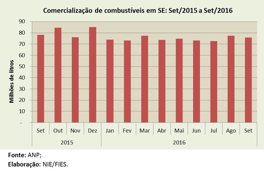 Análise realizada pelo Boletim Sergipe Econômico, parceria do Núcleo de Informações Econômicas (NIE) da Federação das Indústrias do Estado de Sergipe (FIES) e do Departamento de Economia da UFS, com base nos dados da Agência Nacional do Petróleo, Gás Natural e Biocombustíveis (ANP), indicou que as vendas totais de combustíveis, em setembro deste ano, chegaram a mais de 75,7 milhões de litros, assinalando queda de 3,2%, em relação ao mesmo mês de 2015.