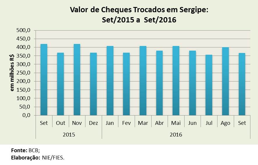 Analisando os dados do Banco Central, em setembro deste ano, observou-se que o valor de cheques trocados em Sergipe foi de R$ 366,1 milhões, sendo 8,5% menor, no comparativo mensal, agosto de 2016. Na comparação anual, o valor foi 15% menor que o volume registrado em setembro de 2015. No acumulado do ano (de janeiro a setembro), o valor total dos cheques trocados superou os R$ 3,5 bilhões, este valor está 55,1% superior aos valores registrados no mesmo período do ano passado.