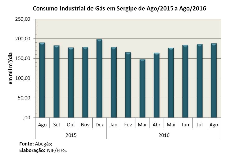 Análise realizada pelo Boletim Sergipe Econômico, parceria do Núcleo de Informações Econômicas (NIE) da Federação das Indústrias do Estado de Sergipe (FIES) e do Departamento de Economia da UFS, com base nos dados da Associação Brasileira das Empresas Distribuidoras de Gás Canalizado (ABEGÁS), apontou que foram consumidos, no mês de agosto deste ano, uma média de 288,9 mil metros cúbicos (m³) de gás diário em Sergipe. O consumo de gás foi 2,2% superior ao do mês anterior. Na comparação anual, em relação ao mesmo mês do ano passado (agosto/2015), o consumo apresentou crescimento de 1,4%.