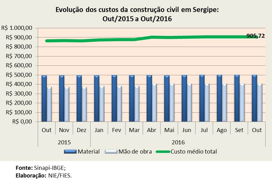 O valor do custo médio por metro quadrado ficou em R$ 905,72, sendo o menor valor registrado entre os estados brasileiros, no mês analisado. Em relação ao mês de outubro de 2015, houve alta de 4,6% no custo médio, e acumulado dos dez meses do ano, o custo médio subiu 4,8%, variações em termos absolutos, ou seja, sem considerar o efeito da inflação no período.