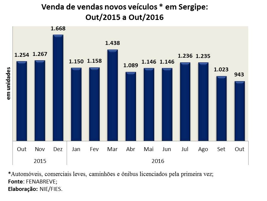 Análise realizada pelo Boletim Sergipe Econômico, parceria do Núcleo de Informações Econômicas (NIE) da Federação das Indústrias do Estado de Sergipe (FIES) e do Departamento de Economia da UFS, com base nos dados da Federação Nacional da Distribuição de Veículos Automotores (FENABRAVE), indicou que as vendas de veículos novos no estado totalizaram 943 unidades, em outubro deste ano. O número de veículos novos, aqui referido, diz respeito a soma dos montantes de automóveis, comerciais leves, caminhões e ônibus licenciados, pela primeira vez, no período em análise. O primeiro emplacamento do veículo é considerado como venda, por causa do prazo estabelecido em lei para isto. Ou seja, o prazo é de 15 (quinze) dias consecutivo após a data de saída do veículo da loja, localizada no estado.