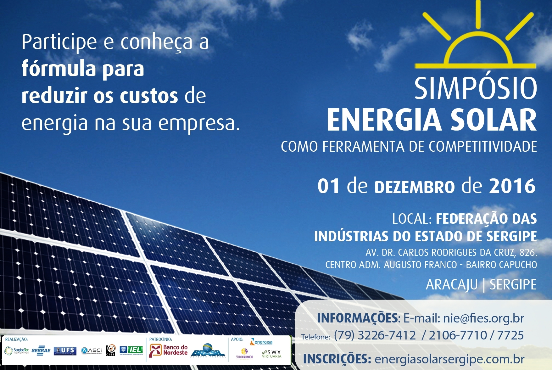 Empreendedores sergipanos terão oportunidade de conhecer a fórmula para reduzir os custos de energia das suas empresas. Isso será possível graças a realização do Primeiro Simpósio Energia Solar como Ferramenta de Competitividade, que acontecerá no dia 1 de dezembro no Auditório da Federação das Indústrias do Estado de Sergipe, às 8h. A proposta é mostrar como tornar a empresa mais competitiva no mercado utilizando a energia fotovoltaica. As inscrições dão direito ao almoço e contemplam um diagnóstico a ser realizado na empresa a respeito da viabilidade da implantação do Sistema de Energia Solar. Inscrições deverão ser feitas através do site: http://energiasolarsergipe.com.br