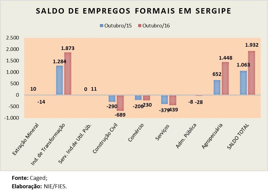 Análise realizada pelo Boletim Sergipe Econômico, parceria do Núcleo de Informações Econômicas (NIE) da Federação das Indústrias do Estado de Sergipe (FIES) e do Departamento de Economia da UFS, com dados do Cadastro Geral de Empregados e Desempregados (Caged), do Ministério do Trabalho e Previdência Social (MTPS), indicou que, no mês de outubro de 2016, Sergipe apresentou um saldo (total de admissões menos total de desligamentos) positivo de 1.932 empregos formais, sendo o primeiro saldo positivo do ano.