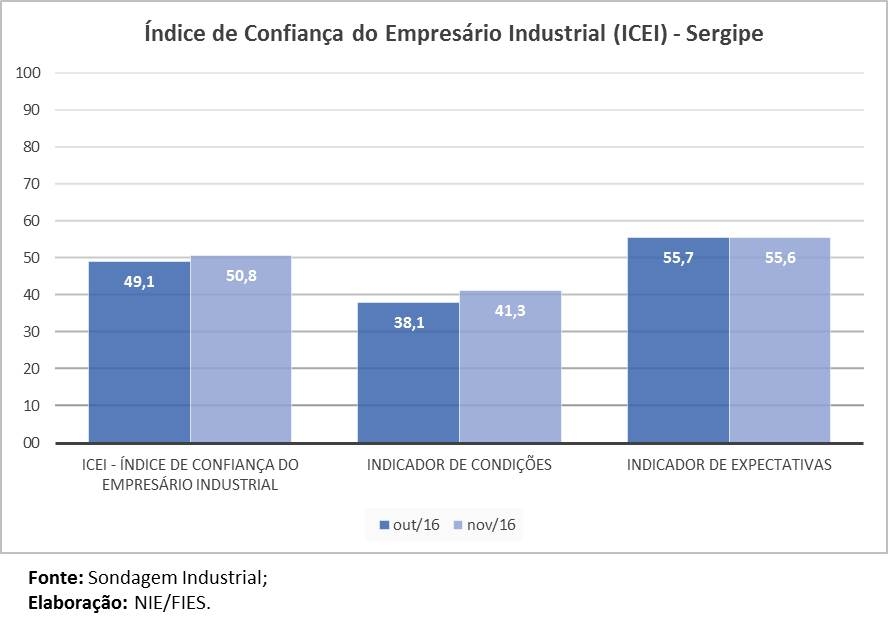 A análise do ICEI - Índice de Confiança do Empresário Industrial, do mês de novembro de 2016, mostrou que os empresários sergipanos permanecem confiantes e otimistas, uma vez que o índice somou 50,8 pontos, no mês em análise, o ICEI ficou 1,7 ponto maior, o que deixou o índice acima da margem dos 50 pontos. O Indicador de expectativas somou 55,6 pontos, confirmando o otimismo. Além disso, mostraram-se confiantes em relação ao futuro das suas empresas e da econômica brasileira, com os indicadores de expectativas somando 57,9 e 52,3 pontos, respectivamente.