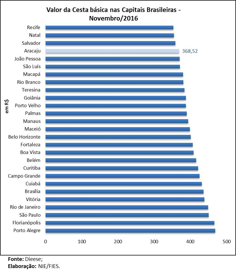 Análise realizada pelo Boletim Sergipe Econômico, parceria do Núcleo de Informações Econômicas (NIE) da Federação das Indústrias do Estado de Sergipe (FIES) e do Departamento de Economia da UFS, com base nos dados da Pesquisa Nacional da Cesta Básica, realizada pelo Departamento Intersindical de Estatística e Estudos Socioeconômicos (DIEESE), apontou que o valor da cesta básica registrado na capital sergipana, em novembro deste ano, foi de R$ 368,52, sendo o quarto menor entre as capitais brasileiras, ficando 2,6% menor que o registrado no mês imediatamente anterior. Desde janeiro de 2016, o DIEESE vem publicando os resultados das 27 capitais brasileiras. O menor valor da cesta básica foi observado em Recife (R$353,08), no mês em análise. Já os maiores valores da cesta básica foram registrados em Porto Alegre (R$ 469,04), Florianópolis (R$ 466,25) e São Paulo (R$ 450,39).