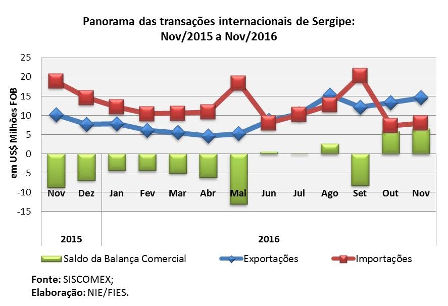 Análise realizada pelo Centro Internacional de Negócios – CIN/SE da Federação das Indústrias do Estado de Sergipe (FIES), com base nos dados do Ministério de Desenvolvimento, Indústria e Comércio Exterior (MDIC), observou-se que as exportações, no mês de novembro deste ano, passaram dos US$ 14,5 milhões, enquanto as importações sergipanas ficaram nos US$ 7,9 milhões. Com este resultado, a balança comercial registrou, no mês analisado, superávit (saldo positivo) de US$ 6,5 milhões, segundo superávit seguido.