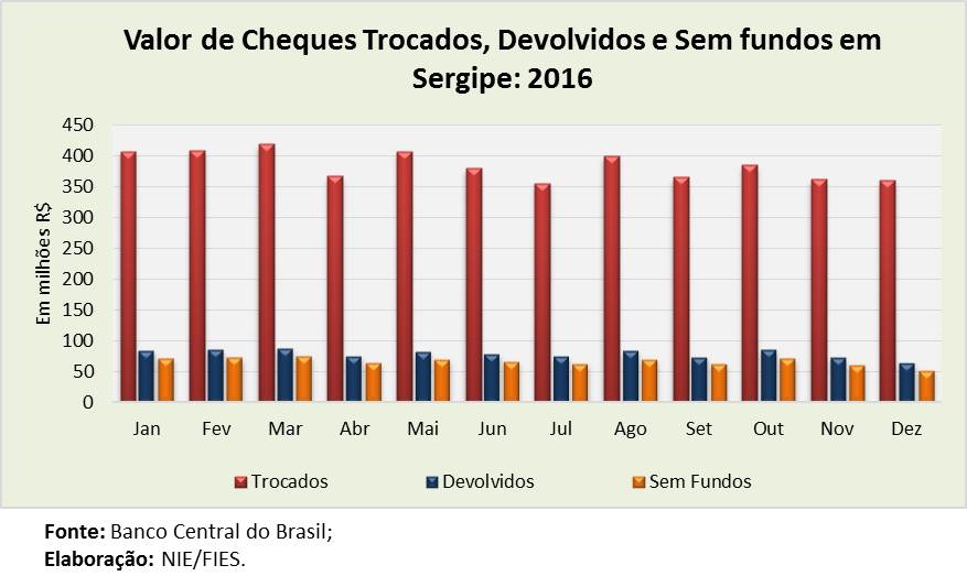 Análise realizada pelo Boletim Sergipe Econômico, parceria do Núcleo de Informações Econômicas (NIE) da Federação das Indústrias do Estado de Sergipe (FIES) e do Departamento de Economia da UFS, com base nos dados do Serasa Experian, mostra que foram compensados 168.306 cheques em Sergipe, no mês de dezembro de 2016, esse volume foi 24,1% menor, quando comparado com o mesmo mês de 2015. Dentre os mais de 168 mil cheques compensados, foram devolvidos 7.601 por falta de fundos, ou seja, 4,5% dos cheques emitidos.