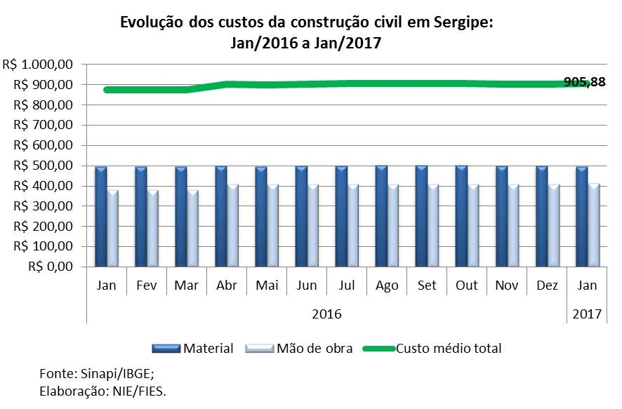 Análise realizada pelo Boletim Sergipe Econômico, parceria do Núcleo de Informações Econômicas (NIE) da Federação das Indústrias do Estado de Sergipe (FIES) e do Departamento de Economia da UFS, com base nos dados do Sistema Nacional de Pesquisa de Custos e Índices da Construção Civil (Sinapi), calculado pelo IBGE em convênio com a Caixa Econômica Federal, revelou que o custo da construção, medido por metro quadrado (m²), em Sergipe, no primeiro mês do ano, assinalou expansão de 0,2% em relação a dezembro último.