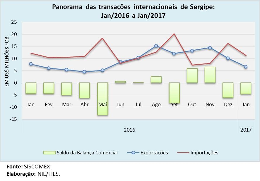 Análise realizada pelo Centro Internacional de Negócios – CIN/SE da FIES, com base nos dados do Ministério de Desenvolvimento, Indústria e Comércio Exterior (MDIC), observou que as exportações sergipanas somaram US$ 6,6 milhões, em janeiro, enquanto as importações sergipanas somaram US$ 11,2 milhões. Com este resultado, a balança comercial fechou com déficit (saldo negativo) de US$ 4,6 milhões, no mês analisado.