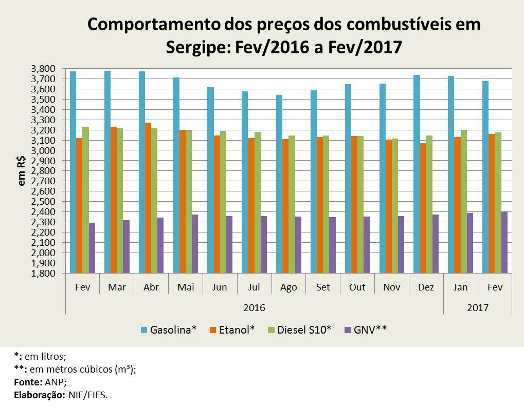 O preço médio do litro fornecido pelas distribuidoras no estado aos postos de combustíveis, foi de R$ 3,275 para a gasolina, registrando queda de 2,8%. O etanol teve preço médio de R$ 2,751, com queda de 1,4%. Já o preço médio do óleo diesel foi de R$ 2,700, assinalando queda de 1,3%. Essas comparações são em relação fevereiro de 2016.