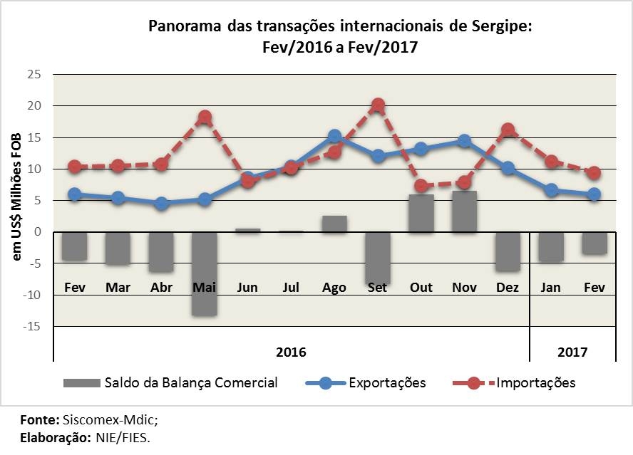 Análise realizada pelo Centro Internacional de Negócios – CIN/SE da Federação das Indústrias do Estado de Sergipe (FIES), com base nos dados do Ministério de Desenvolvimento, Indústria e Comércio Exterior (MDIC), apontou que as exportações, no mês de fevereiro deste ano, se aproximaram dos US$ 6 milhões, enquanto as importações sergipanas ficaram nos US$ 9,4 milhões. Com este resultado, a balança comercial registrou, no mês analisado, déficit de US$ 3,4 milhões.