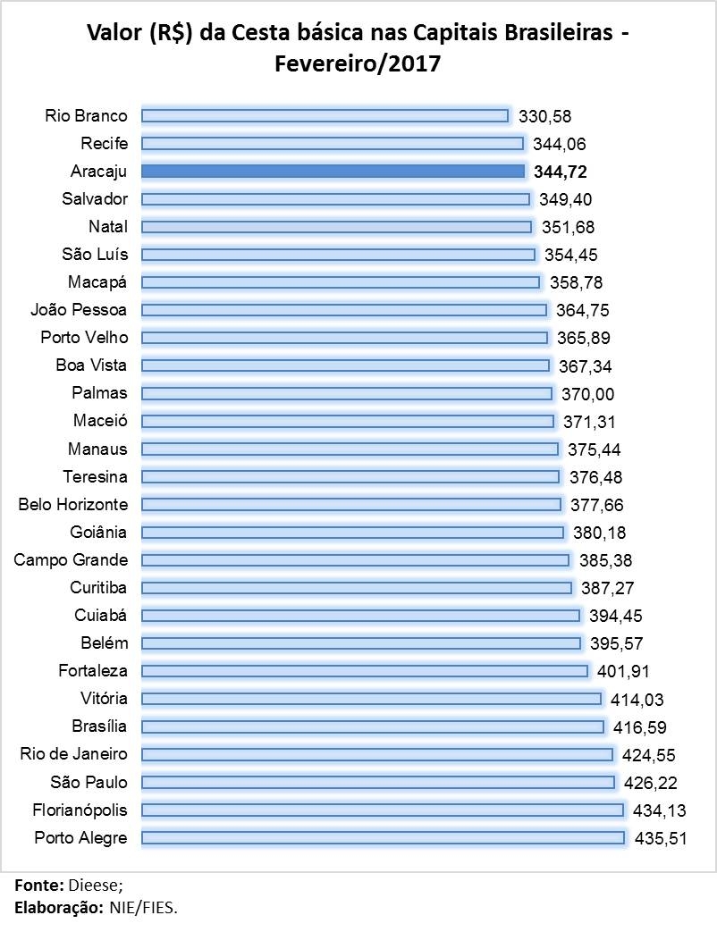 Dentre as 27 capitais brasileiras pesquisadas, a cesta de Aracaju registrou o terceiro menor valor do país, no mês analisado, ficando atrás somente do Rio Branco (R$330,58) e Recife (R$ 344,06). Em relação a fevereiro do ano passado, observou-se retração de 4,8% na cesta básica da capital sergipana.