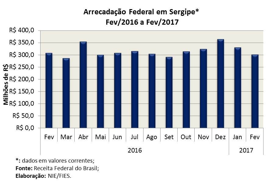 Análise realizada pelo Boletim Sergipe Econômico, parceria do Núcleo de Informações Econômicas (NIE) da Federação das Indústrias do Estado de Sergipe (FIES) e do Departamento de Economia da UFS, com base nos dados da Receita Federal, verificou que a arrecadação de tributos federais, do segundo mês do ano, totalizou R$ 300,9 milhões, assinalando recuo real de 9,2%, quando comparado com a arrecadação do mês imediatamente anterior, janeiro de 2017. Essa taxa registrada considera o efeito da inflação no período, medido pelo Índice Nacional de Preço ao Consumidor Amplo (IPCA).