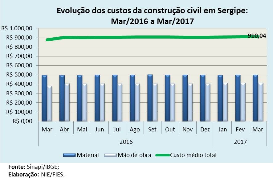 Análise realizada pelo Boletim Sergipe Econômico, parceria do Núcleo de Informações Econômicas (NIE) da Federação das Indústrias do Estado de Sergipe (FIES) e do Departamento de Economia da UFS, com base nos dados do Sistema Nacional de Pesquisa de Custos e Índices da Construção Civil (Sinapi), calculado pelo IBGE em convênio com a Caixa, revelou que o custo da construção, medido por metro quadrado (m²), em Sergipe, no terceiro mês do ano, assinalou alta de 0,15% em relação ao segundo mês do ano corrente. Em relação ao custo médio de março de 2016, observou-se elevação de 3,9%.