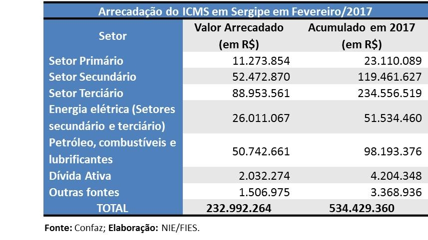Análise realizada pelo Boletim Sergipe Econômico, parceria do Núcleo de Informações Econômicas (NIE) da Federação das Indústrias do Estado de Sergipe (FIES) e do Departamento de Economia da UFS, com base nos dados do Conselho Nacional da Política Fazendária (Confaz), apontou que a arrecadação do Imposto sobre Circulação de Mercadorias e Prestação de Serviços (ICMS) aproximou-se dos R$ 233 milhões, no segundo mês do ano.