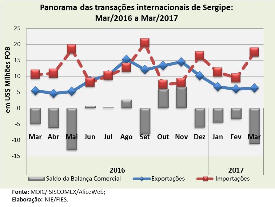 Análise realizada pelo Centro Internacional de Negócios – CIN/SE da Federação das Indústrias do Estado de Sergipe (FIES), com base nos dados do Ministério de Desenvolvimento, Indústria e Comércio Exterior (MDIC), apontou que as exportações, no mês de março deste ano, foram de aproximadamente US$ 6,2 milhões, enquanto as importações sergipanas ultrapassaram os US$ 17,4 milhões. Com este resultado, a balança comercial registrou déficit de US$ 11,2 milhões, no mês em análise, sendo o maior déficit desde maio de 2016.