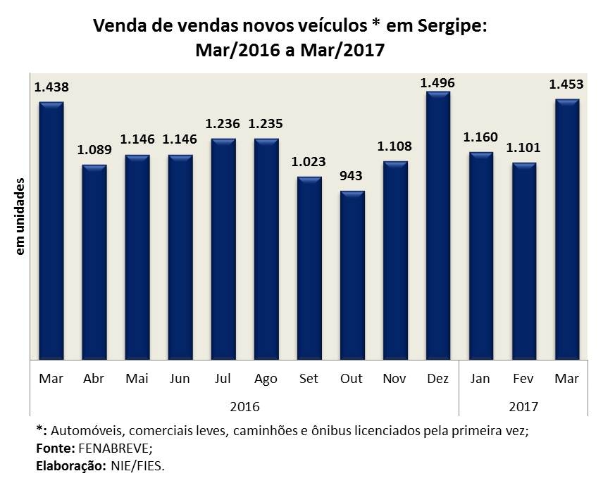 Análise realizada pelo Boletim Sergipe Econômico, parceria do Núcleo de Informações Econômicas (NIE) da Federação das Indústrias do Estado de Sergipe (FIES) e do Departamento de Economia da UFS, com base nos dados da Federação Nacional da Distribuição de Veículos Automotores (FENABRAVE), indicou que as vendas de veículos novos no estado totalizaram 1.453 unidades, no terceiro mês do ano.