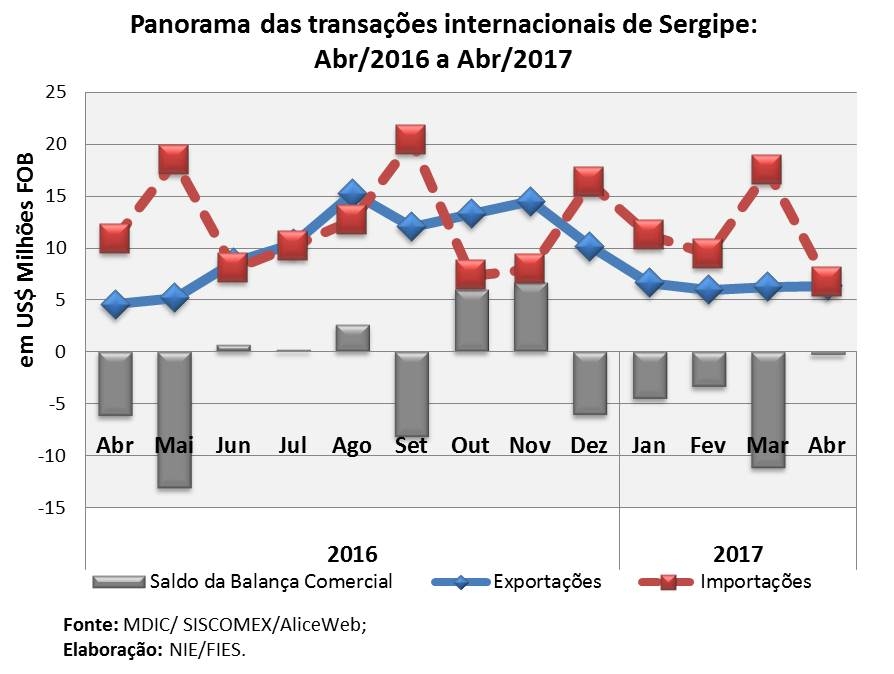 Análise realizada pelo Centro Internacional de Negócios – CIN/SE da Federação das Indústrias do Estado de Sergipe (FIES), com base nos dados do Ministério de Desenvolvimento, Indústria e Comércio Exterior (MDIC), apontou que as exportações, no mês de abril deste ano, foram de aproximadamente US$ 6,3 milhões, enquanto as importações sergipanas ficaram em US$ 6,7 milhões. Com este resultado, a balança comercial registrou o menor déficit do ano, somando US$ 364 mil, no mês em análise.