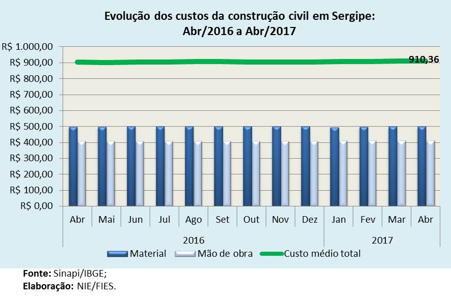 Análise realizada pelo Boletim Sergipe Econômico, parceria do Núcleo de Informações Econômicas (NIE) da Federação das Indústrias do Estado de Sergipe (FIES) e do Departamento de Economia da UFS, com base nos dados do Sistema Nacional de Pesquisa de Custos e Índices da Construção Civil (Sinapi), calculado pelo Instituto Brasileiro de Geografia e Estatística (IBGE) em convênio com a Caixa Econômica Federal, revelou que o custo da construção, medido por metro quadrado (m²), em Sergipe, no quarto mês do ano, permanecendo praticamente estável em relação ao terceiro mês do ano corrente. Em relação ao custo médio de abril de 2016, observou-se elevação de 0,8%.