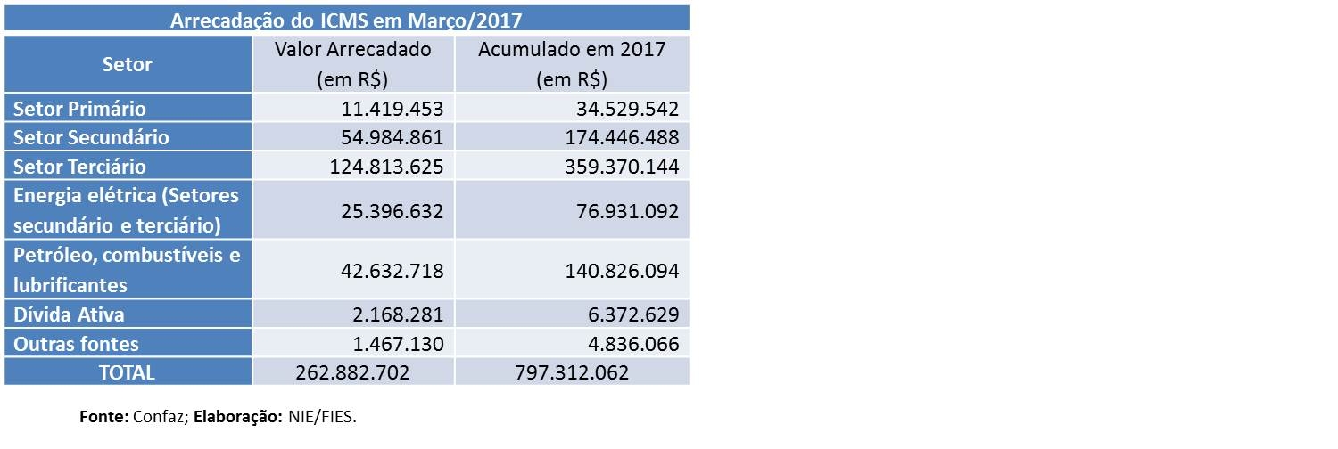 No primeiro trimestre do ano corrente, a arrecadação do ICMS no estado ultrapassou os R$ 797,3 milhões, registrando elevação de 5,3%, em termos reais, em comparação com o mesmo período de 2016.