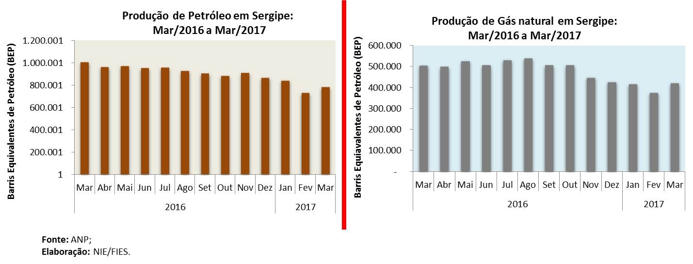 Análise realizada pelo Boletim Sergipe Econômico, parceria do Núcleo de Informações Econômicas (NIE) da Federação das Indústrias do Estado de Sergipe (FIES) e do Departamento de Economia da UFS, com base nos dados da Agência Nacional do Petróleo, Gás Natural e Biocombustíveis (ANP), mostrou que a produção de petróleo no estado, em março de 2017, ultrapassou os 781 mil barris equivalentes de petróleo (BEP), ficando 7,2% acima da produção do mês imediatamente anterior, fevereiro último. Já no comparativo anual (março/2016), houve retração de aproximadamente 22,2% na produção. No primeiro trimestre de 2017 a produção atingiu os 2,3 milhões de bep, com retração de 20,6%, quando comparado com o mesmo período de 2016.