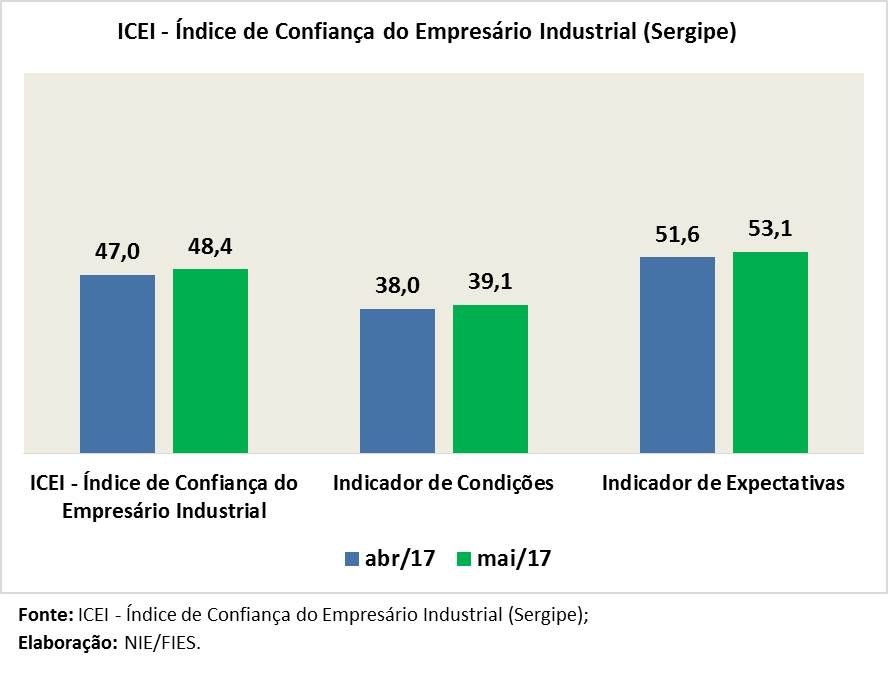 A análise do ICEI - Índice de Confiança do Empresário Industrial, do mês de maio de 2017, mostra crescimento da confiança dos empresários sergipanos, uma vez que o índice atingiu 48,4 pontos, ficando 1,4 ponto acima do registrado no mês anterior. Já o indicador de expectativas (para os próximos seis meses) somou 53,1 pontos, mostrando que os empresários estão otimistas para os próximos meses, o resultado foi 1,5 ponto superior ao registrado no mês anterior. Os empresários mostraram-se otimistas também quanto às Expectativas da Empresa, uma vez que o indicador ficou acima da margem dos 50 pontos. Já o indicador referente às Expectativas do Estado ficou abaixo do esperado, mostrando pessimismo dos empresários nesse quesito.