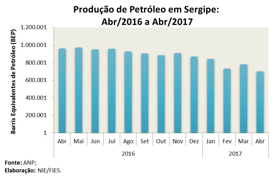 Análise realizada pelo Boletim Sergipe Econômico, parceria do Núcleo de Informações Econômicas (NIE) da Federação das Indústrias do Estado de Sergipe (FIES) e do Departamento de Economia da UFS, com base nos dados da Agência Nacional do Petróleo, Gás Natural e Biocombustíveis (ANP), mostrou que a produção de petróleo no estado, em abril de 2017, ficou em 698 mil barris equivalentes de petróleo (BEP), ficando 10,6% abaixo da produção do mês imediatamente anterior, março último. Já no comparativo anual (abril/2016), houve retração de 27,3% na produção. No primeiro quadrimestre de 2017 a produção ficou próxima dos 3 milhões de bep, com retração de 22,3%, quando comparado com o mesmo período de 2016.
