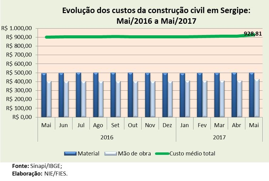 Análise realizada pelo Boletim Sergipe Econômico, parceria do Núcleo de Informações Econômicas (NIE) da Federação das Indústrias do Estado de Sergipe (FIES) e do Departamento de Economia da UFS, com base nos dados do Sistema Nacional de Pesquisa de Custos e Índices da Construção Civil (Sinapi), calculado pelo Instituto Brasileiro de Geografia e Estatística (IBGE) em convênio com a Caixa Econômica Federal, revelou que o custo da construção, medido por metro quadrado (m²), em Sergipe, no quinto mês do ano, aumentou 2% em relação ao último mês de abril. No comparativo com maio de 2016, observou-se elevação de 3,1%.