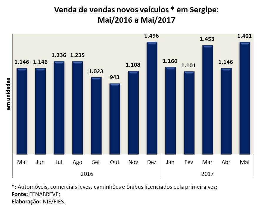 Análise realizada pelo Boletim Sergipe Econômico, parceria do Núcleo de Informações Econômicas (NIE) da Federação das Indústrias do Estado de Sergipe (FIES) e do Departamento de Economia da UFS, com base nos dados da Federação Nacional da Distribuição de Veículos Automotores (FENABRAVE), indicou que as vendas de veículos novos no estado totalizaram 1.491 unidades, no quinto mês do ano.