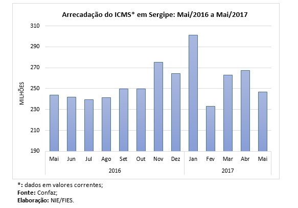 Análise realizada pelo Boletim Sergipe Econômico, parceria do Núcleo de Informações Econômicas (NIE) da Federação das Indústrias do Estado de Sergipe (FIES) e do Departamento de Economia da UFS, com base nos dados do Conselho Nacional da Política Fazendária (Confaz), apontou que a arrecadação do Imposto sobre Circulação de Mercadorias e Prestação de Serviços (ICMS), em Sergipe, totalizou R$ 246,6 milhões, no quinto mês do ano.