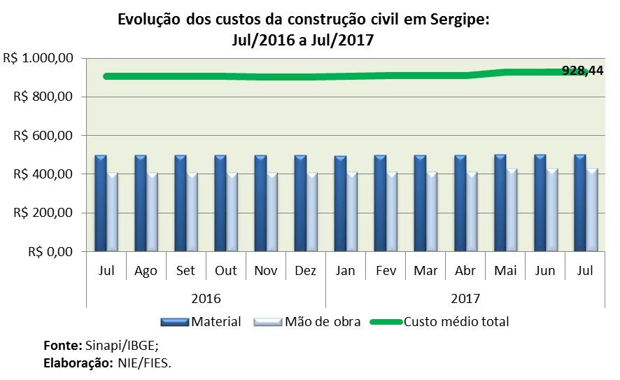 Análise realizada pelo Boletim Sergipe Econômico, parceria do Núcleo de Informações Econômicas (NIE) da Federação das Indústrias do Estado de Sergipe (FIES) e do Departamento de Economia da UFS, com base nos dados do Sistema Nacional de Pesquisa de Custos e Índices da Construção Civil (Sinapi), calculado pelo Instituto Brasileiro de Geografia e Estatística (IBGE) em convênio com a Caixa Econômica Federal, revelou que o custo da construção, medido por metro quadrado (m²), em Sergipe, no último mês de julho, se manteve estável em relação ao último mês de junho. No entanto, quando comparado com julho de 2016, observou-se elevação de 2,6%.