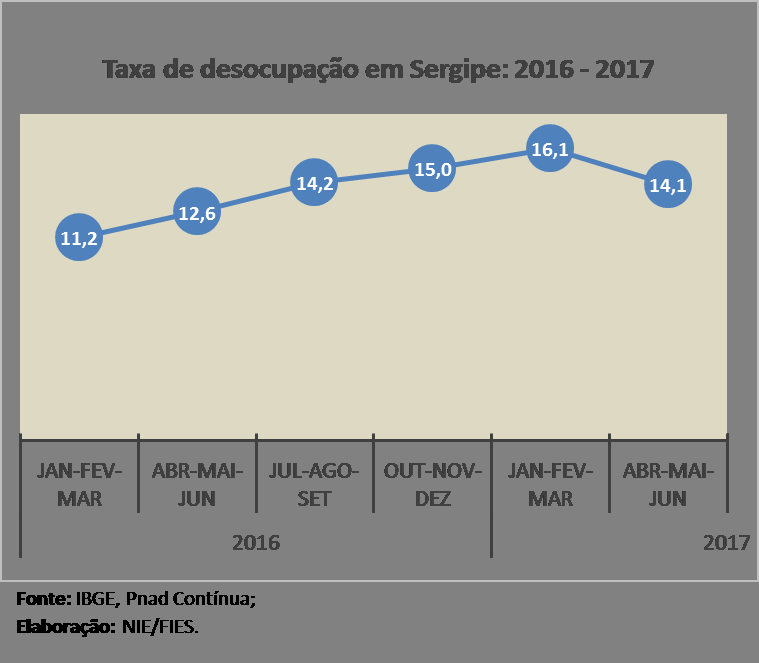 De acordo com os dados da Pesquisa Nacional por Amostra de Domicílios Contínua – Trimestral (Pnad Contínua), divulgada pelo IBGE, o número de pessoas ocupadas em Sergipe cresceu no segundo trimestre de 2017, na comparação com o primeiro trimestre do ano, passando de 840 mil para 881 mil pessoas. Do lado oposto, o número de pessoas desocupadas caiu, saindo de 161 mil para 144 mil desocupados, em igual período de comparação. A taxa de desocupação (percentual de pessoas desocupadas em relação a força de trabalho) ficou em 14,1% em Sergipe, dois pontos percentuais abaixo do registrado no trimestre imediatamente anterior, a última queda da taxa de desocupação tinha ocorrido no terceiro trimestre de 2015, com retração de 0,5 ponto percentual.