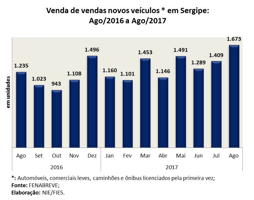 Análise realizada pelo Boletim Sergipe Econômico, parceria do Núcleo de Informações Econômicas (NIE) da Federação das Indústrias do Estado de Sergipe (FIES) e do Departamento de Economia da UFS, com base nos dados da Federação Nacional da Distribuição de Veículos Automotores (FENABRAVE), indicou que as vendas de veículos novos no estado totalizaram 1.673 unidades, no oitavo mês do ano.