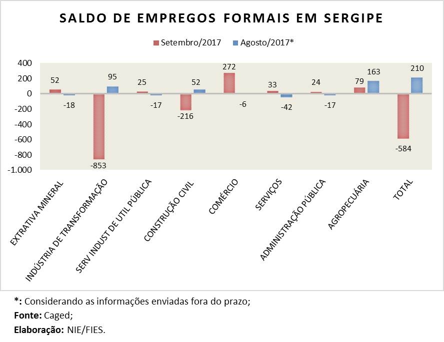 Análise realizada pelo Boletim Sergipe Econômico, parceria do Núcleo de Informações Econômicas (NIE) da Federação das Indústrias do Estado de Sergipe (FIES) e do Departamento de Economia da UFS, com base nos dados do Cadastro Geral de Empregados e Desempregados (Caged), do Ministério do Trabalho e Previdência Social (MTPS), indicou que, em setembro deste ano, houve saldo negativo de 584 empregos formais no estado. O saldo é fruto da diferença entre admissões (5.796) e desligamentos (6.380) no mês em análise. Nos nove primeiros meses do ano, Sergipe contabiliza saldo negativo de 6.157 empregos.