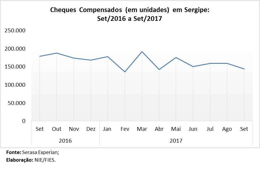 Análise realizada pelo Boletim Sergipe Econômico, parceria do Núcleo de Informações Econômicas (NIE) da Federação das Indústrias do Estado de Sergipe (FIES) e do Departamento de Economia da UFS, com base nos dados do Serasa Experian, mostra que foram compensados 143.649 cheques em Sergipe, no mês de setembro do ano corrente. Essa quantidade foi 19,5% menor, quando comparado com o mesmo mês do ano passado, e 9,9% menor, que o registrado no mês imediatamente anterior. Dentre os mais de 143 mil cheques compensados, foram devolvidos 5.711 cheques por falta de fundos, ou seja, aproximadamente 4% dos cheques emitidos.