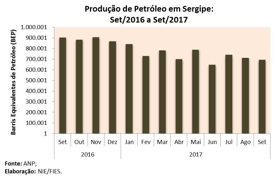 Análise realizada pelo Boletim Sergipe Econômico, parceria do Núcleo de Informações Econômicas (NIE) da Federação das Indústrias do Estado de Sergipe (FIES) e do Departamento de Economia da UFS, com base nos dados da Agência Nacional do Petróleo, Gás Natural e Biocombustíveis (ANP), mostrou que a produção de petróleo no estado, em setembro de 2017, ficou em 692,2 mil barris equivalentes de petróleo (BEP), ficando 2,6% abaixo da produção do mês imediatamente anterior, agosto último. Já no comparativo anual (setembro/2016), a retração atingiu os 23,3% na produção. No acumulado do ano corrente, janeiro a setembro, a produção ficou próxima dos 6,6 milhões de bep, com retração de 23,2%, quando comparado com o mesmo período de 2016.