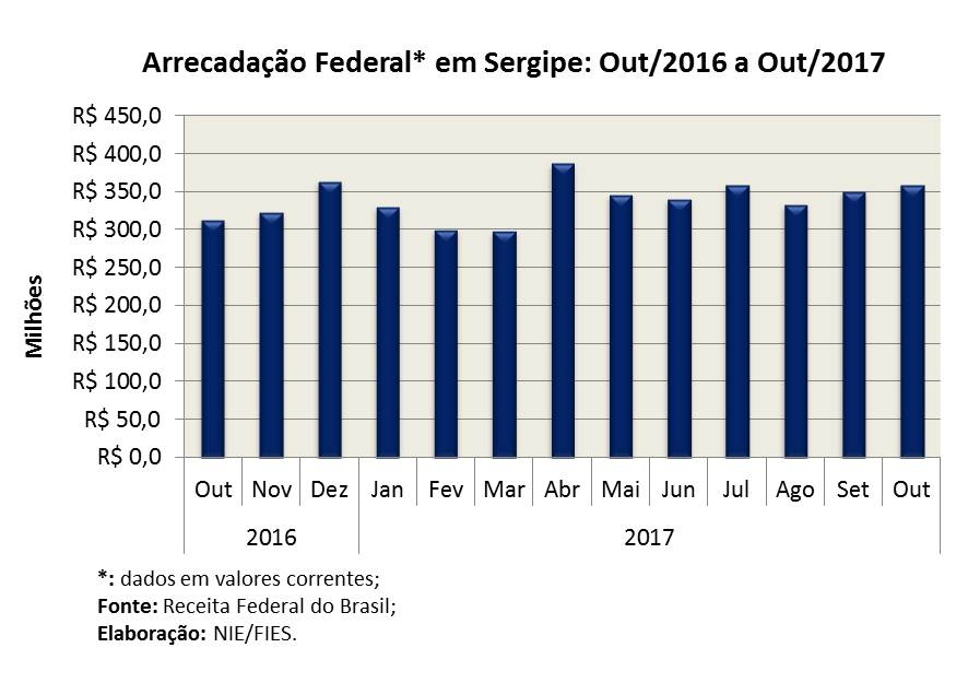 Análise realizada pelo Boletim Sergipe Econômico, parceria do Núcleo de Informações Econômicas (NIE) da Federação das Indústrias do Estado de Sergipe (FIES) e do Departamento de Economia da UFS, com base nos dados da Receita Federal, verificou que a arrecadação de tributos federais, no mês de outubro de 2017, ultrapassou os R$ 359 milhões, assinalando expansão de 11,5%, quando comparado com a arrecadação do mesmo mês do ano anterior, outubro de 2016. Na comparação com a arrecadação do mês anterior, o crescimento real ficou em 2,1%. Essas variações consideram o efeito da inflação no período, medido pelo Índice Nacional de Preço ao Consumidor Amplo (IPCA).