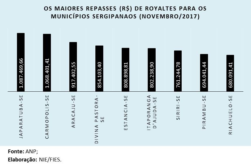 No mês de novembro de 2017, os municípios de Japaratuba e Carmópolis tiveram os maiores repasses de royalties, entre todos os municípios sergipanos, recebendo aproximadamente R$ 1,1 milhão, cada. Enquanto isso, os municípios de Aracaju, Divina Pastora, Estância e Itaporanga d’Ajuda receberam R$ 917 mil, R$ 854 mil, R$ 808 mil e R$ 802 mil, respectivamente. Outros municípios como Siriri, Pirambu e Riachuelo receberam R$ 761 mil, R$ 694 mil e R$ 680 mil, respectivamente, referente à extração de petróleo e gás.